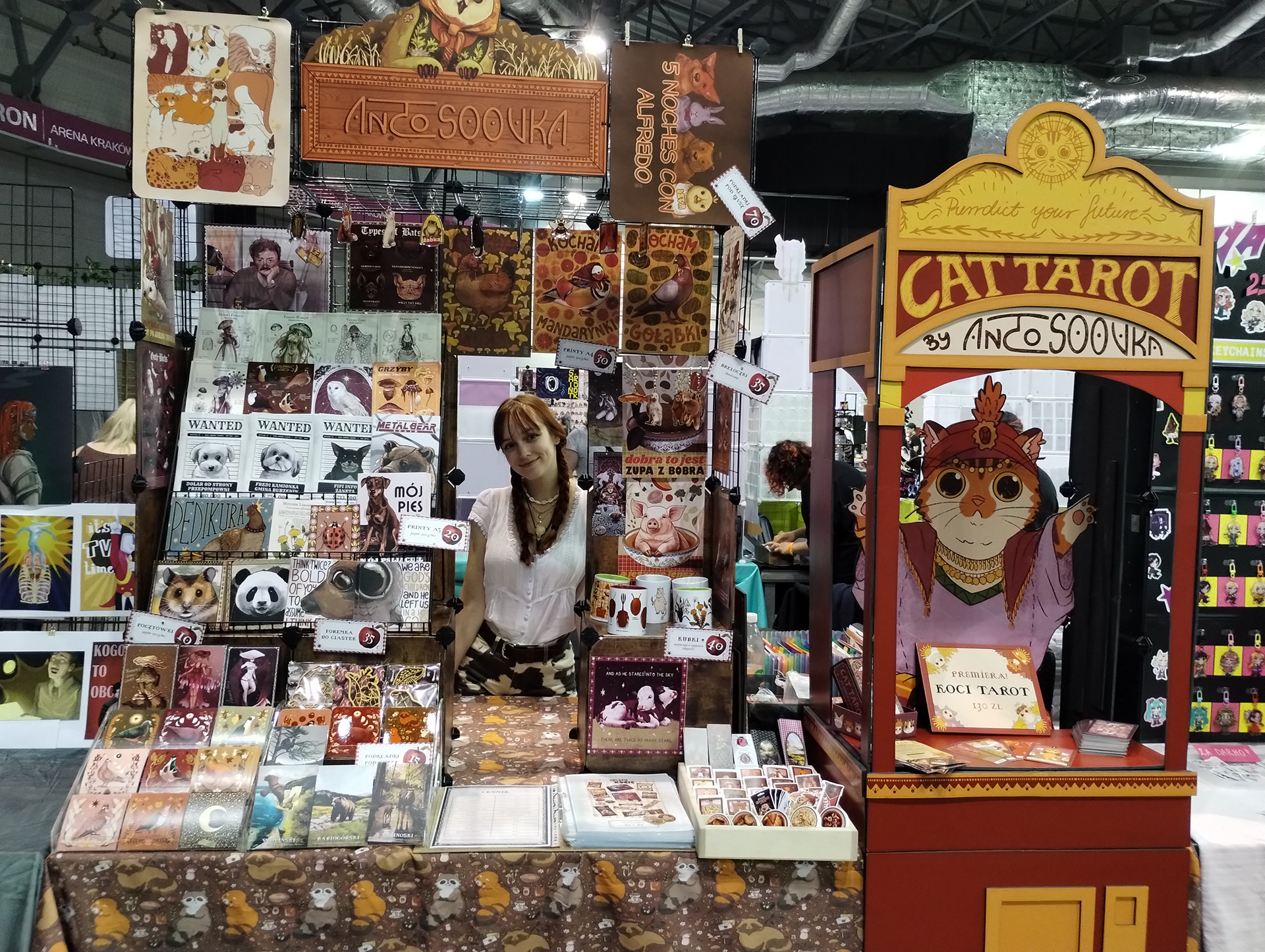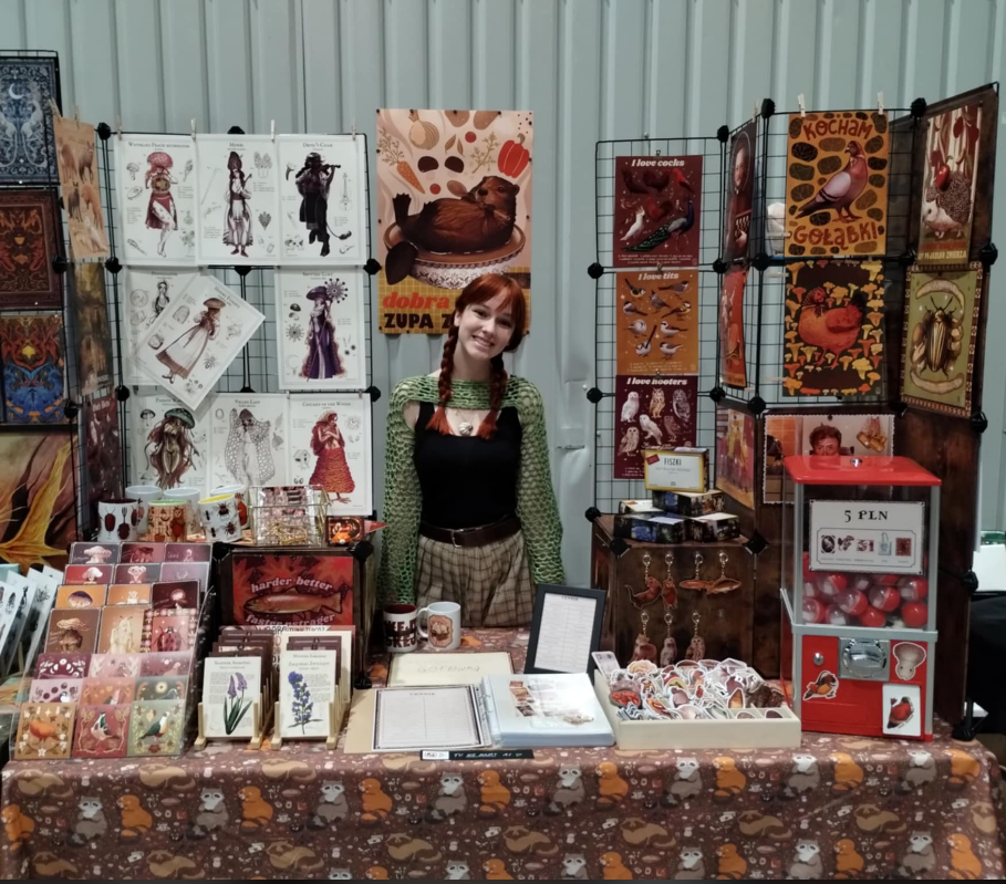 Tak też całe godziny spędzałam na rysowaniu, malowaniu, rzeźbieniu i właściwie każdej kreatywnej rzeczy, za jaką byłam w stanie się zabrać - najpierw przez całą podstawówkę w ognisku plastycznym, następnie przez sześć lat w Ogólnokształcącej Szkole Sztuk Pięknych w Opolu. Po ukończeniu opolskiego plastyczniaka ze specjalizacją w snycerstwie, wyjechałam do stolicy Wielkopolski by studiować grafikę projektową na UAPie, co też robię do dziś. W międzyczasie połączyłam swoje dziecięce marzenia i jako ilustratorka zaczęłam wystawiać się na targach i konwentach, notabene tworząc ten swój własny “sklepik”, a następnie, w czerwcu 2025, rozpoczynając własną działalność gospodarczą.