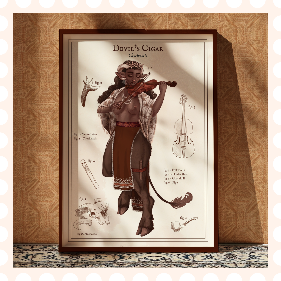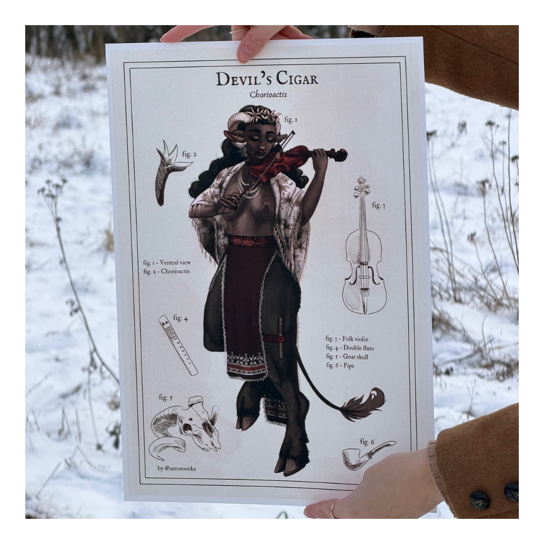 Ręcznie rysowany plakat przedstawiający grzyba (Devils Cigar) w formie pięknej kobiety. Całość jest stylizowana na kartę z atlasu przyrodniczego – dookoła postaci znajdują się różne jej atrybuty, pozwalające na smucie domysłów o jej historii. Całość jest częścią całej serii plakatów z tzw. grzybabami – w przyszłości planuję stworzyć z nich cały atlas, póki co dostępne są jedynie pojedyncze ilustracje bez opisów. Grafika narysowana została własnoręcznie bez użycia AI. Plakat idealnie sprawdzi się jako dekoracja ścienna do sypialni, salonu czy jadalni, dodając wnętrzu charakteru i humoru.  Doskonały także jako prezent dla fanek grzybów 🙂
