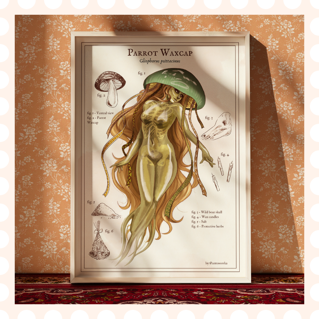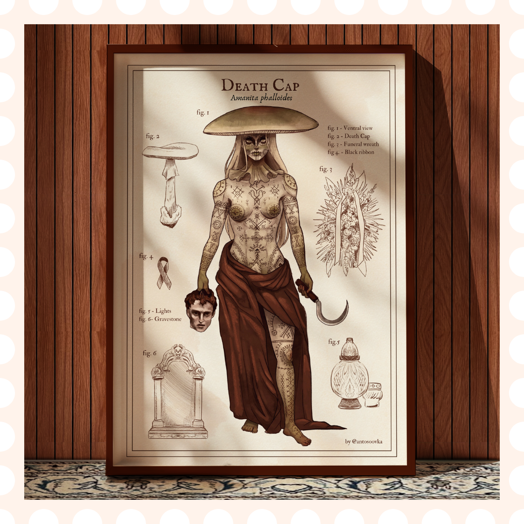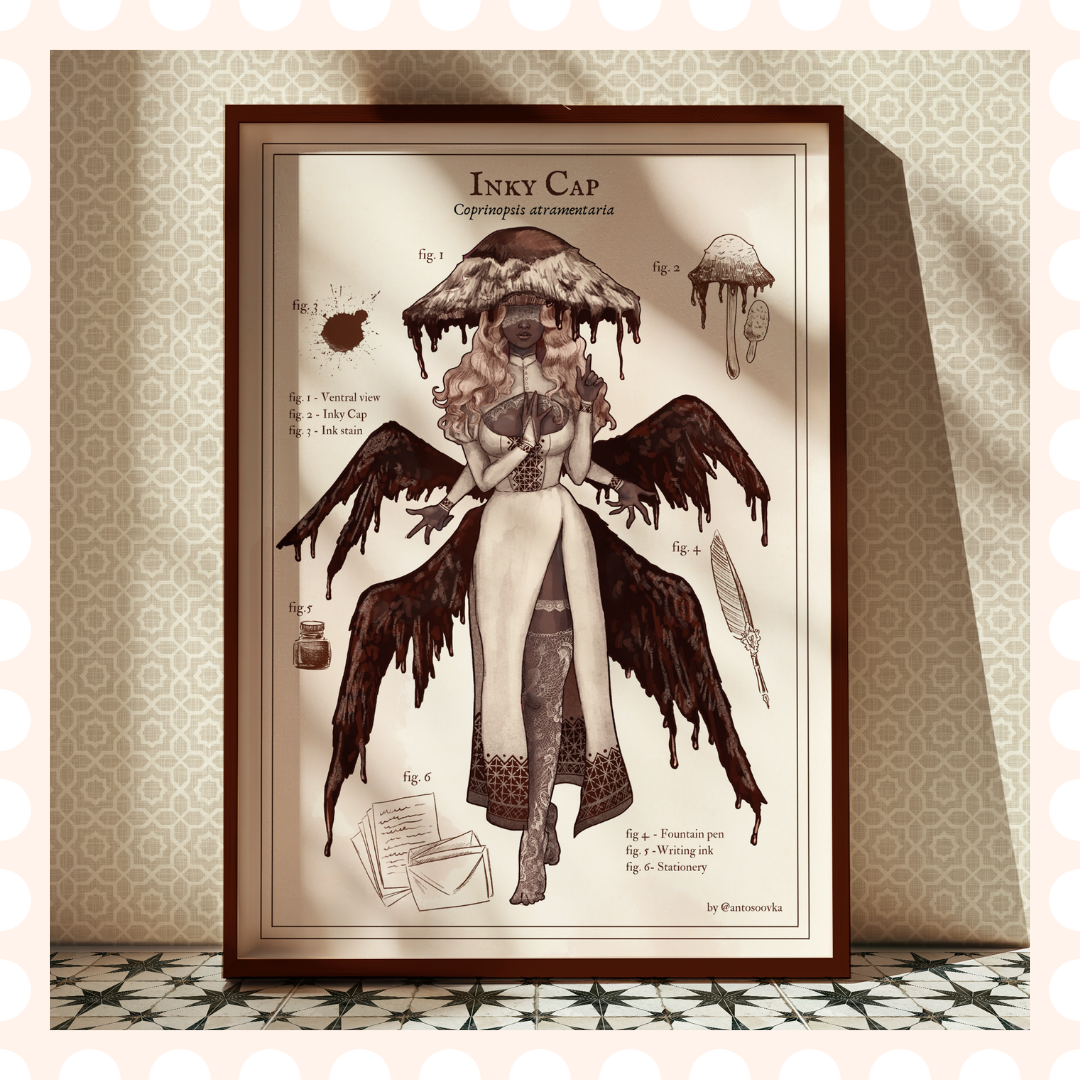 Ręcznie rysowany plakat przedstawiający grzyba – Czernidłaka Kołpakowatego w formie pięknej kobiety. Całość jest stylizowana na kartę z atlasu przyrodniczego – dookoła postaci znajdują się różne jej atrybuty, pozwalające na smucie domysłów o jej historii. Całość jest częścią całej serii plakatów z tzw. grzybabami – w przyszłości planuję stworzyć z nich cały atlas, póki co dostępne są jedynie pojedyncze ilustracje bez opisów. Grafika narysowana została własnoręcznie bez użycia AI. Plakat idealnie sprawdzi się jako dekoracja ścienna do sypialni, salonu czy jadalni, dodając wnętrzu charakteru i humoru.  Doskonały także jako prezent dla fanek grzybów 🙂