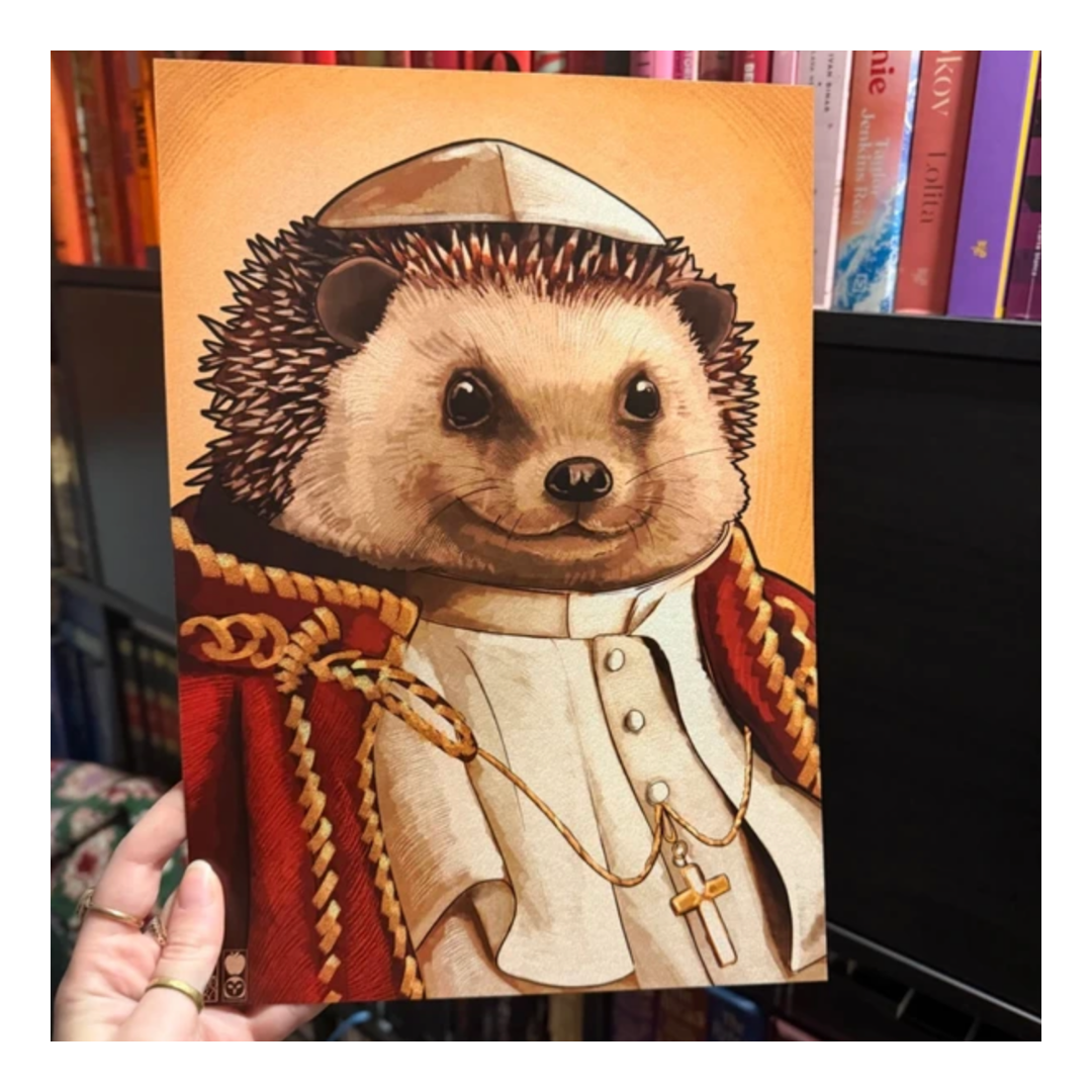 Unikatowy, ręcznie rysowany plakat przedstawiający jeża w stroju papieża, tworząc „papjeża”.
