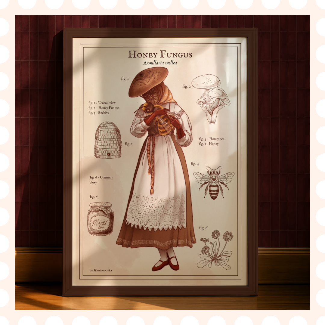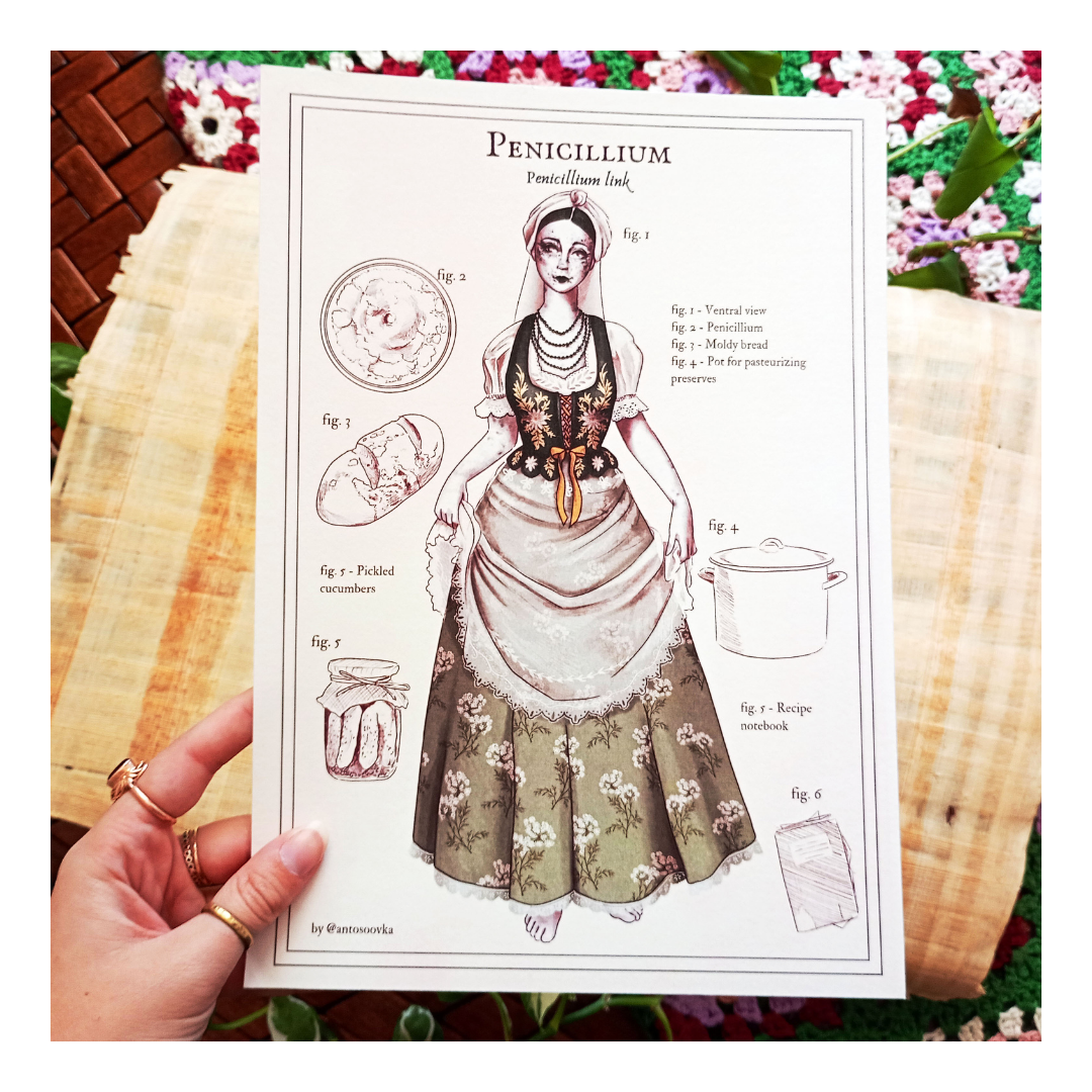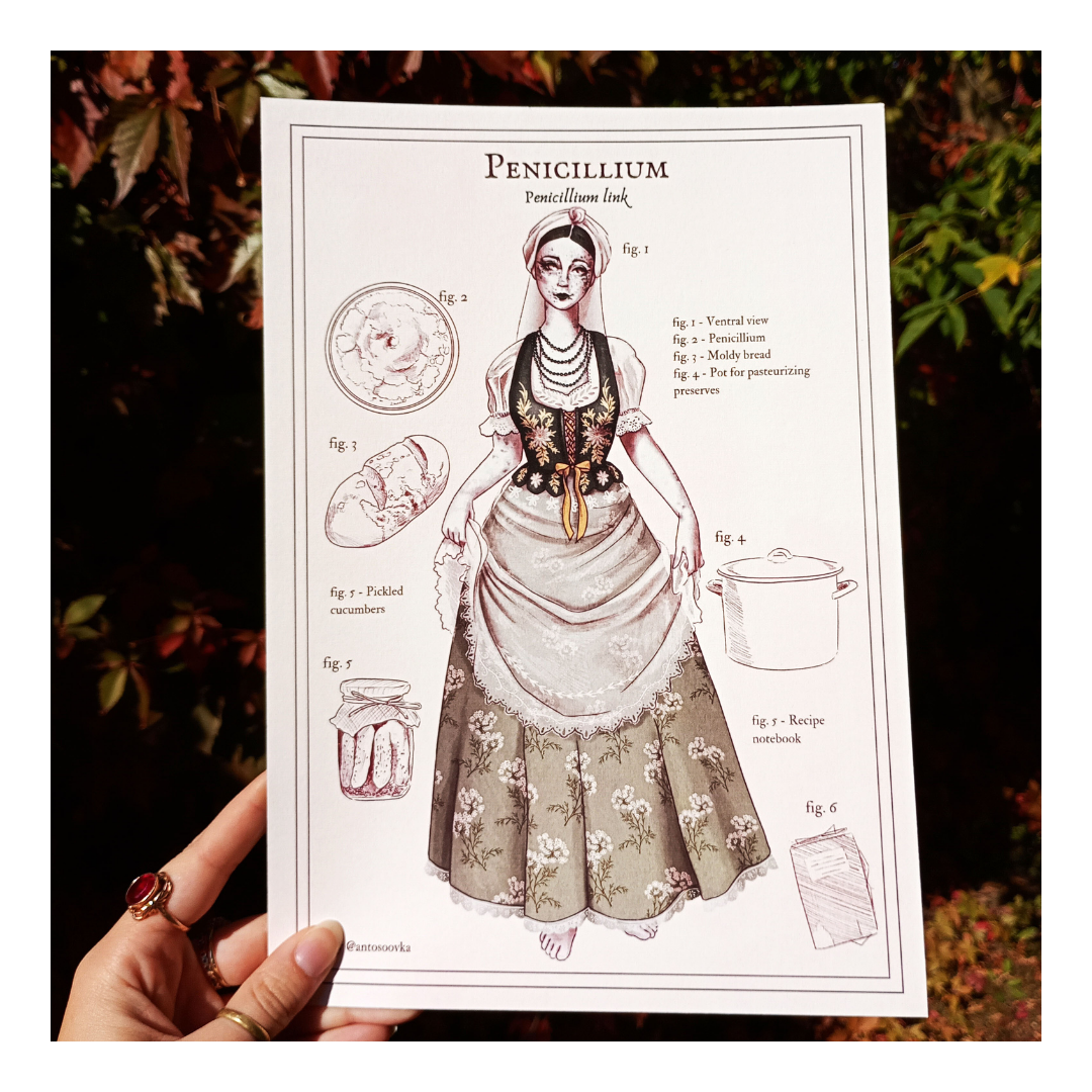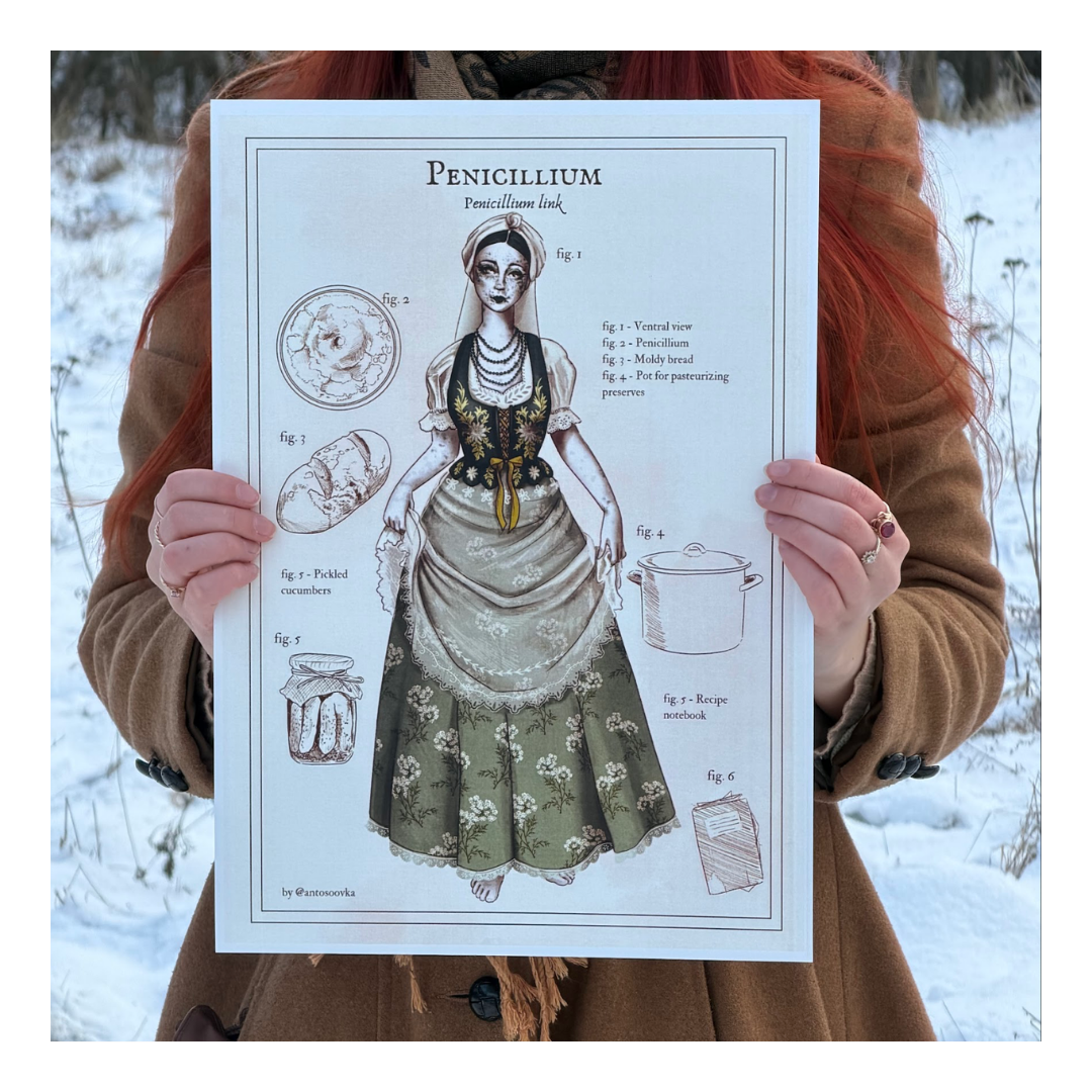 Ręcznie rysowany plakat przedstawiający grzyba – Penicylinę, w formie pięknej kobiety. Całość jest stylizowana na kartę z atlasu przyrodniczego – dookoła postaci znajdują się różne jej atrybuty, pozwalające na smucie domysłów o jej historii. Całość jest częścią całej serii plakatów z tzw. grzybabami – w przyszłości planuję stworzyć z nich cały atlas, póki co dostępne są jedynie pojedyncze ilustracje bez opisów. Grafika narysowana została własnoręcznie bez użycia AI. Plakat idealnie sprawdzi się jako dekoracja ścienna do sypialni, salonu czy jadalni, dodając wnętrzu charakteru i humoru. Doskonały także jako prezent dla fanek grzybów 🙂