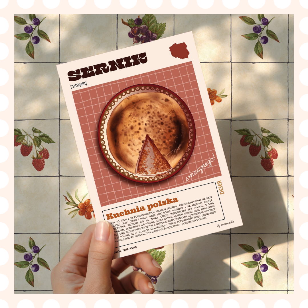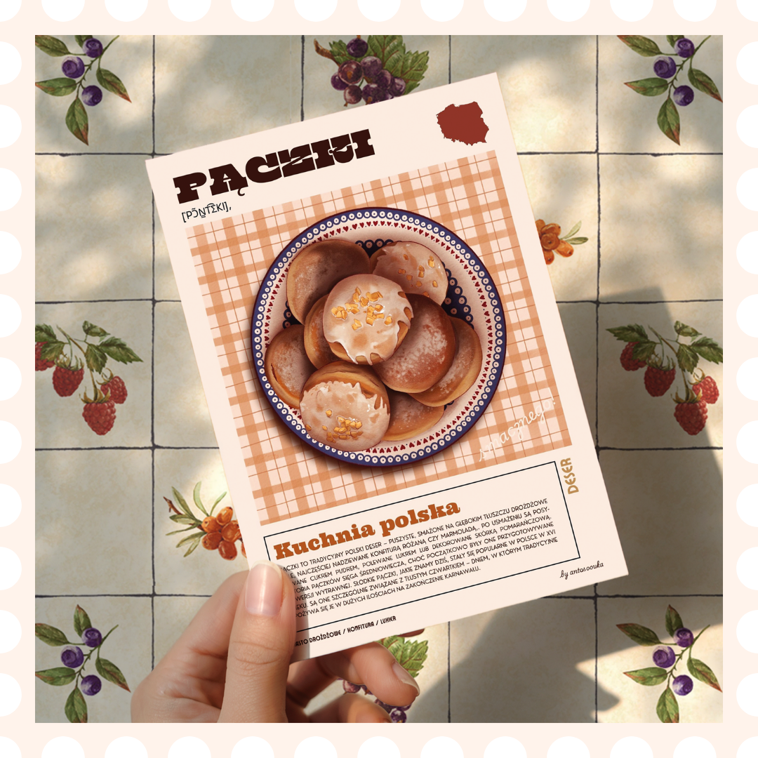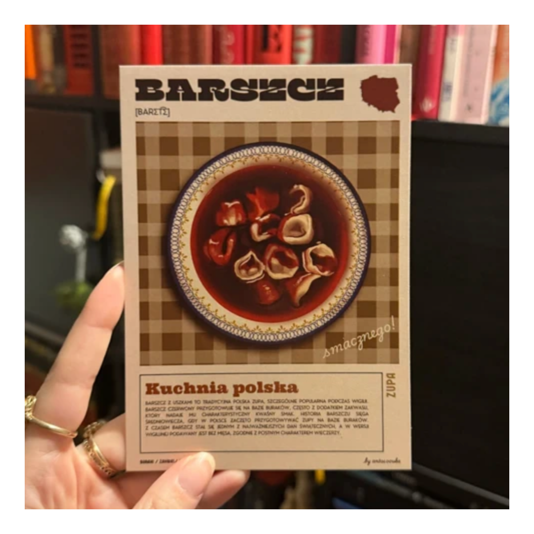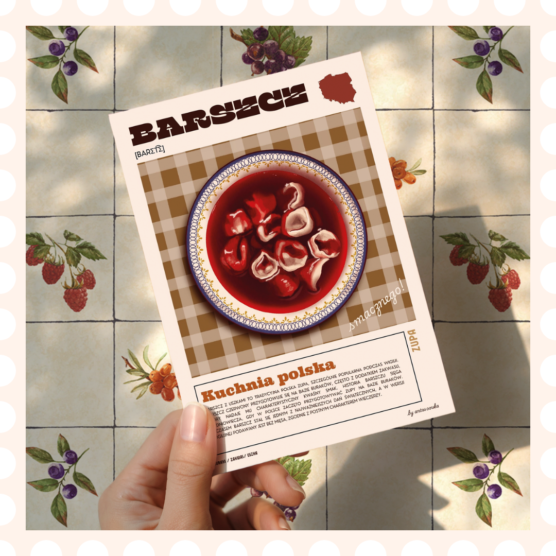 Unikatowa, ręcznie rysowana pocztówka w stylu PRL z barszczem z uszkami – kultową polską zupą. Ilustracja zainspirowana została estetyką dawnych opakowań i grafiki użytkowej z czasów PRL – jest ona częścią serii różnych znanych polskich dań, które zdecydowałam się przedstawić w swoim stylu w ramach większego projektu przepiśnika z recepturami moich babć. Mam nadzieję, że smak tej nostalgii czuć na języku!