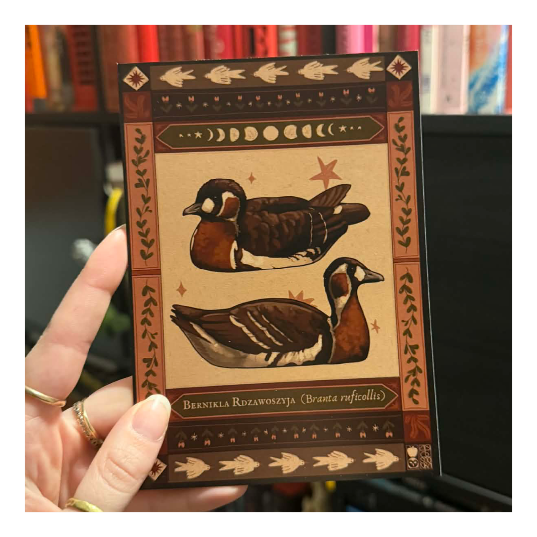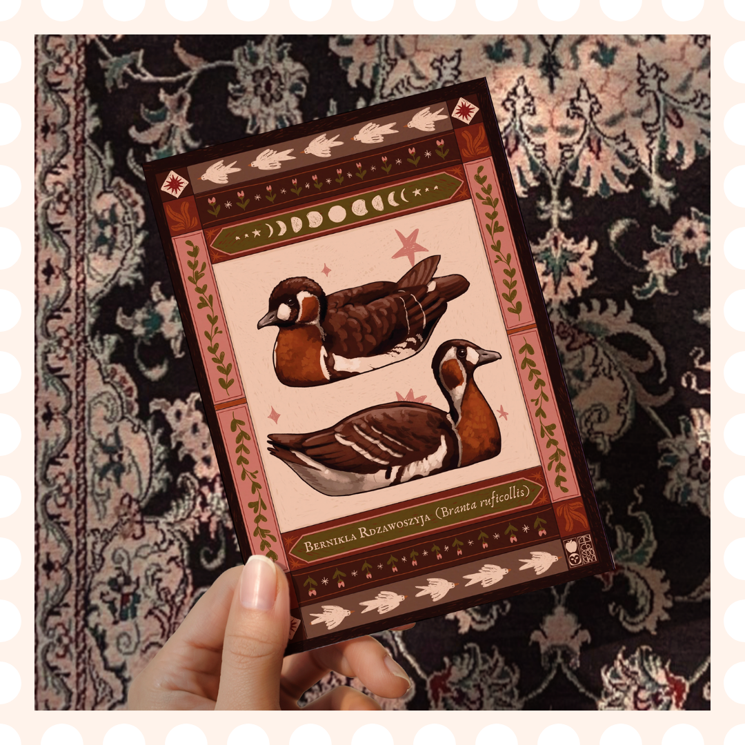 Unikatowa, ręcznie rysowana pocztówka z berniklą rdzawoszyją i piękną ozdobną ramką. Rysunek jest częścią większej ptasiej serii, którą rysowałam w ramach Avian August – wyzwaniu polegającemu na rysowaniu różnych ptaków w ciągu całego sierpnia.  Pocztówka idealnie nada się zarówno do wysłania bliskiej osobie ze słabością do gęsi czy jako drobna dekoracja ścienna we wnętrzach typu cottagecore, ruralcore czy goblincore.