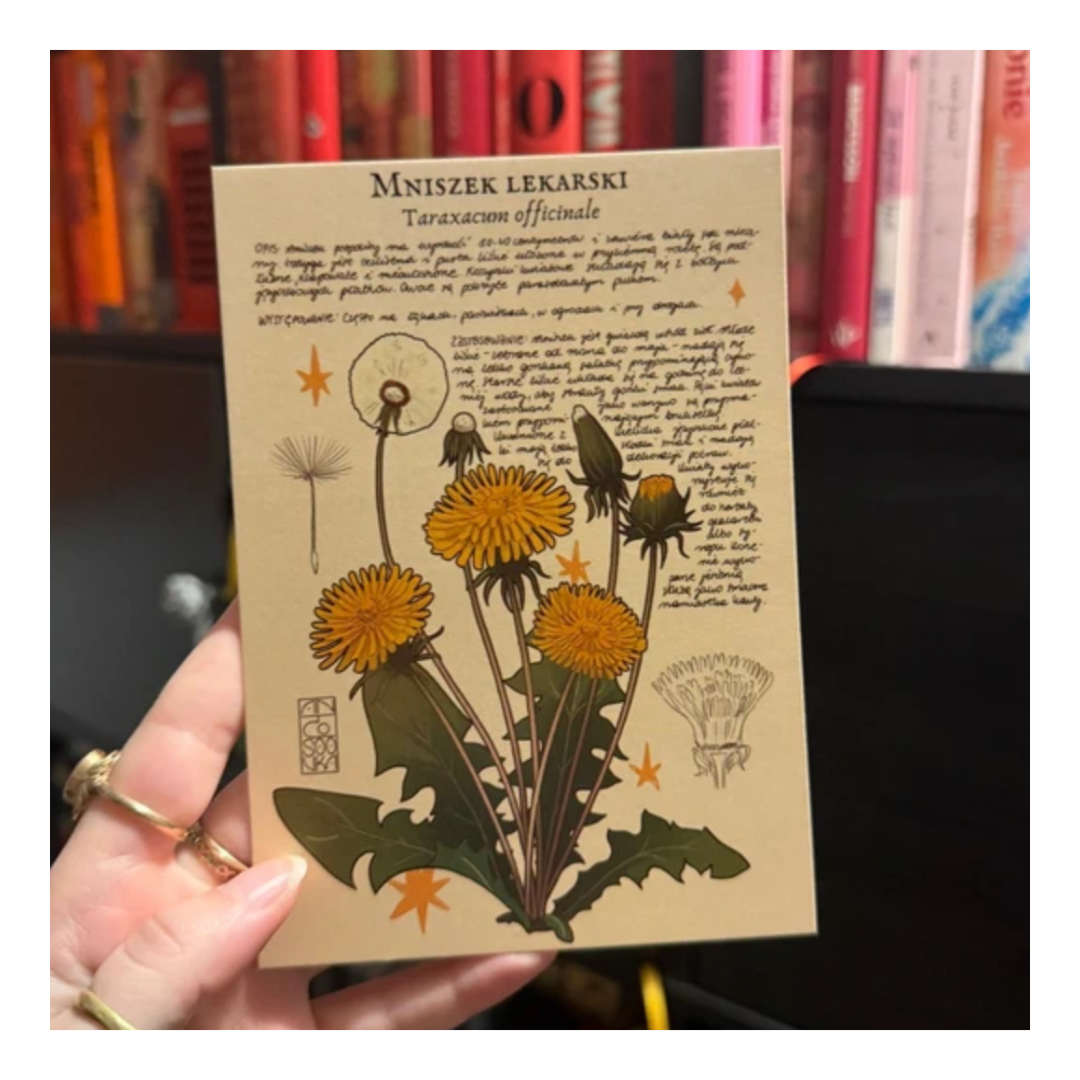 Unikatowa, pięknie rysowana pocztówka z mniszkiem lekarskim w stylu klasycznych ilustracji botanicznych z atlasów roślin. Jest częścią większej botanicznej serii, którą początkowo rysowałam w ramach jednego z projektów studenckich poświęconym dzikim zapylaczom. Poza rysunkiem samej rośliny, na pocztówce są ręcznie pisane notatki na jej temat i ołówkowe szkice – całość nawiązuje stylistycznie do vintage grafik botanicznych. Pocztówka idealnie nada się zarówno do wysłania bliskiej osobie ze słabością do kwiatów polnych czy jako drobna dekoracja ścienna we wnętrzach typu cottagecore, ruralcore czy goblincore.