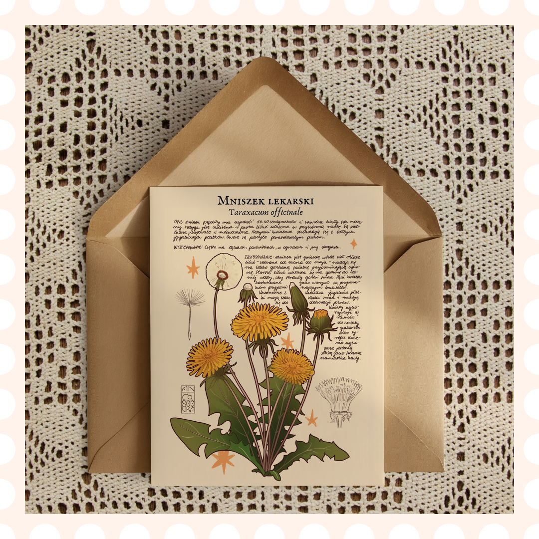 Unikatowa, pięknie rysowana pocztówka z mniszkiem lekarskim w stylu klasycznych ilustracji botanicznych z atlasów roślin.