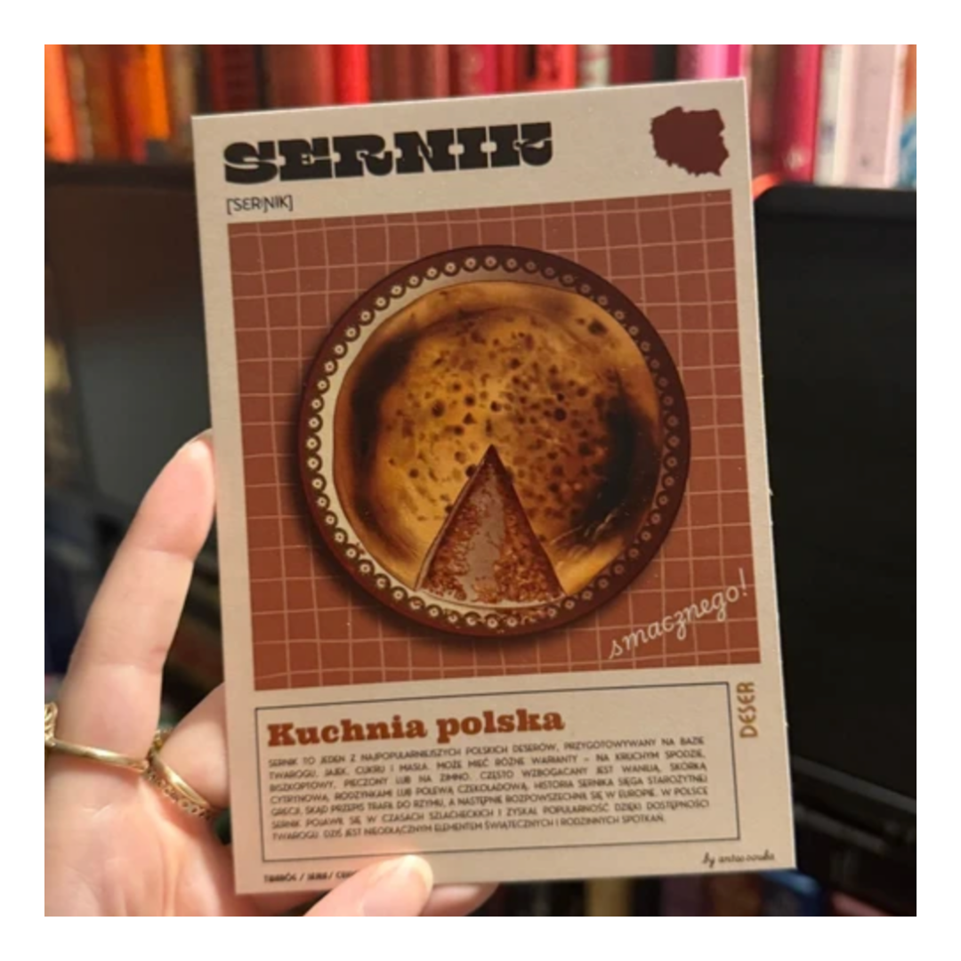 Unikatowa, ręcznie rysowana pocztówka w stylu PRL z sernikiem – kultowym polskim ciastem. Ilustracja zainspirowana została estetyką dawnych opakowań i grafiki użytkowej z czasów PRL – jest ona częścią serii różnych znanych polskich dań, które zdecydowałam się przedstawić w swoim stylu w ramach większego projektu przepiśnika z recepturami moich babć. Mam nadzieję, że smak tej nostalgii czuć na języku!