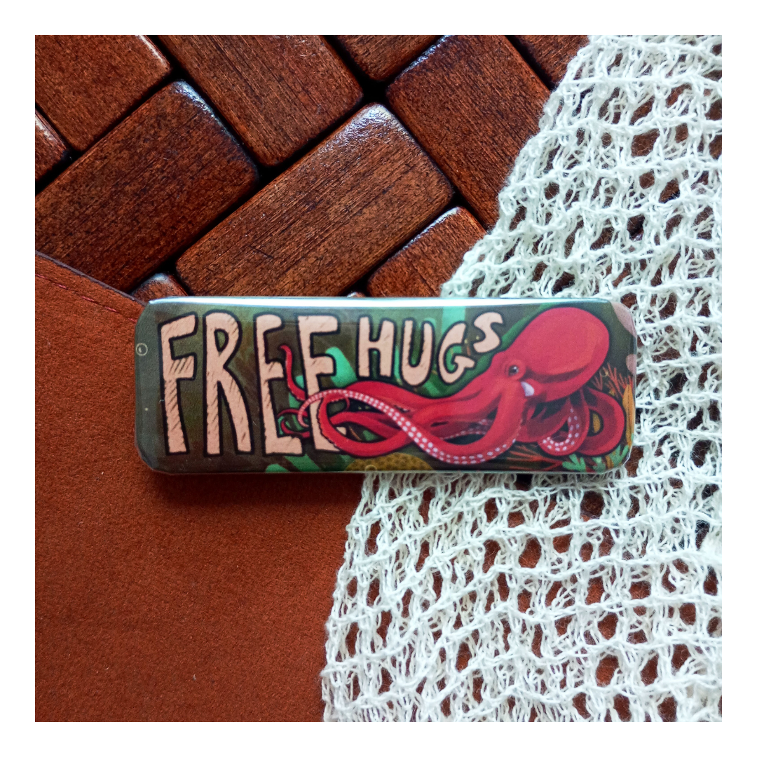 Urocza przypinka z ośmiornicą pod wodą i napisem „free hugs”.