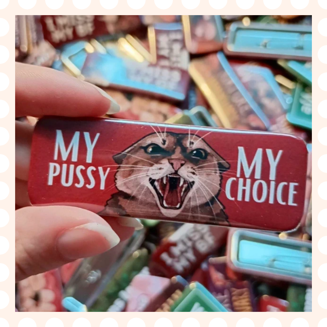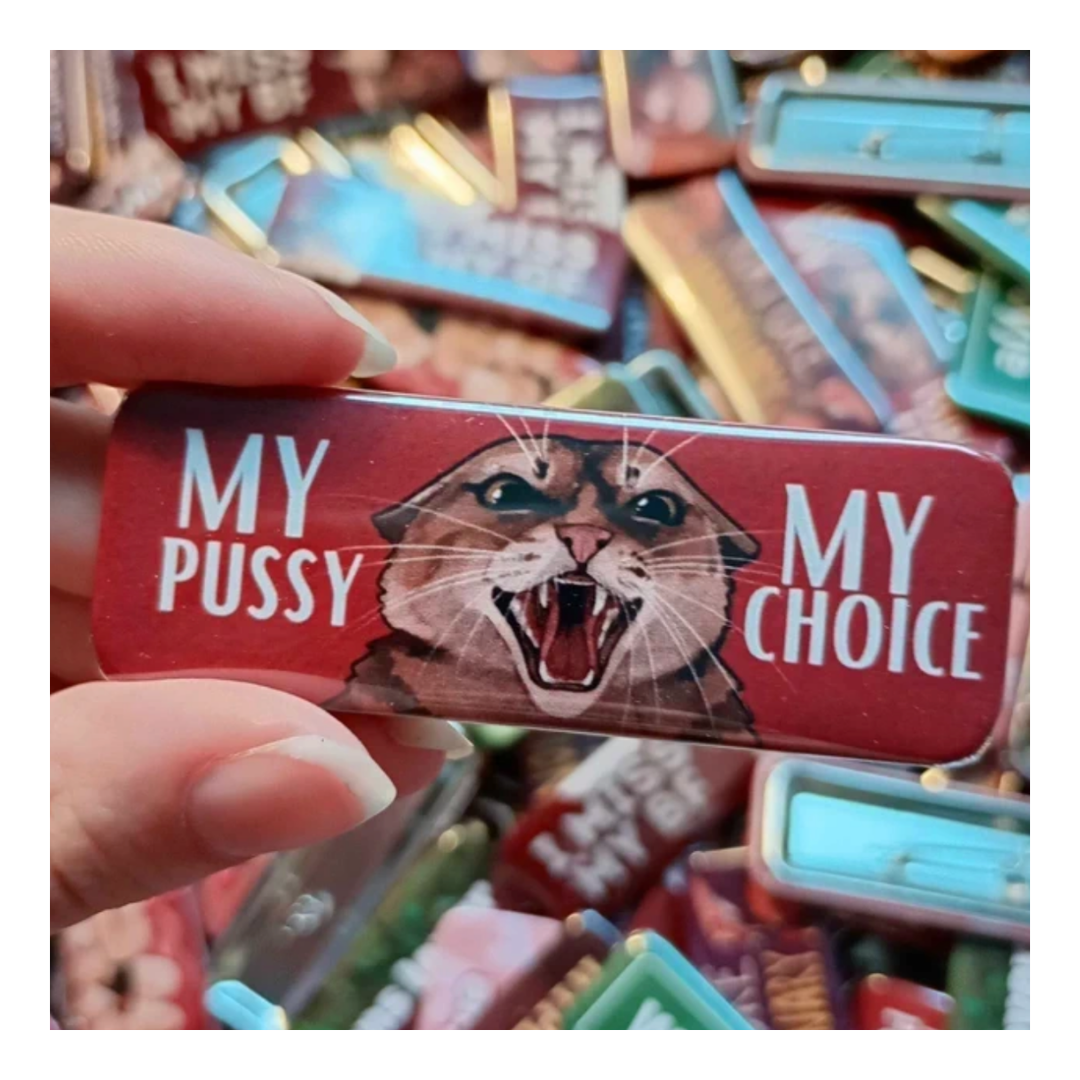 Ręcznie rysowana przypinka z syczącym kotem i napisem „MY PUSSY MY CHOICE”. Idealna dla feministek, miłośniczek kotów i zwolenniczek ruchu „my body my choice”. Sama przypinka świetnie wygląda przypięta do torby, plecaka, kurtki jeansowej, płaszcza, shopperki lub jako element kolekcji pinów. Posiada klasyczne zapięcie na agrafkę, jest lekka i trwała.