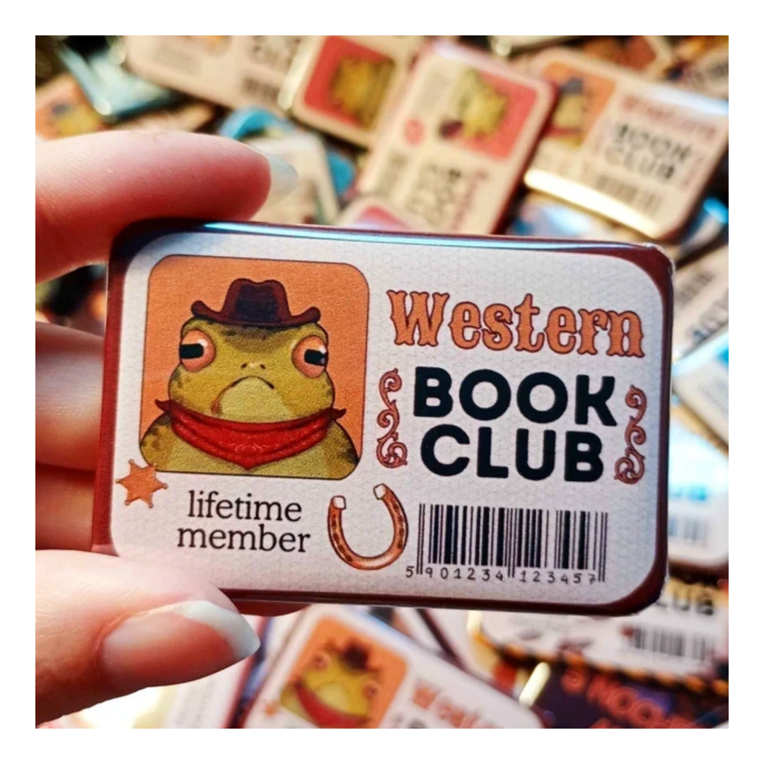 Urocza przypinka stylizowana na kartę członkowską fikcyjnego book clubu skupionego wokół literatury westernowej.