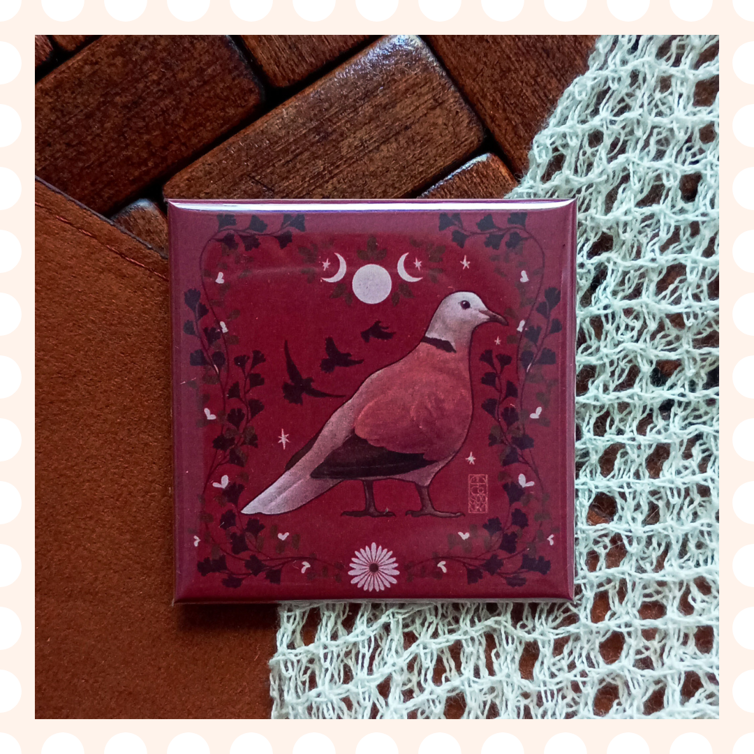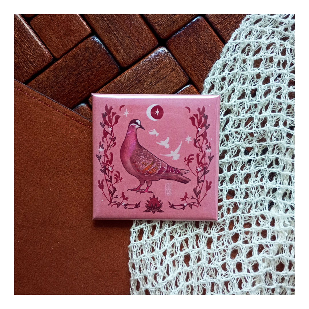 Ręcznie rysowana przypinka z błyskolotką białogardłą (Common Bronzewing) na tle w odcieniu cielistego, pudrowego różu .  Zachwyca intensywnymi barwami ptaka i subtelnymi ornamentami roślinnymi dookoła niego, które podkreśla jego egzotyczne piękno. Idealna dla miłośników ptaków, ornitologii i natury. Ilustracja powstała w ramach challenge’u Avian August – miesiąca w trakcie którego rysowałam same gołębie różnych gatunków. Przypinka świetnie nada się na ozdobę plecaka, torby, kurtki lub prezent dla fana egzotycznych gatunków. Posiada klasyczne zapięcie na agrafkę, jest lekka i trwała.