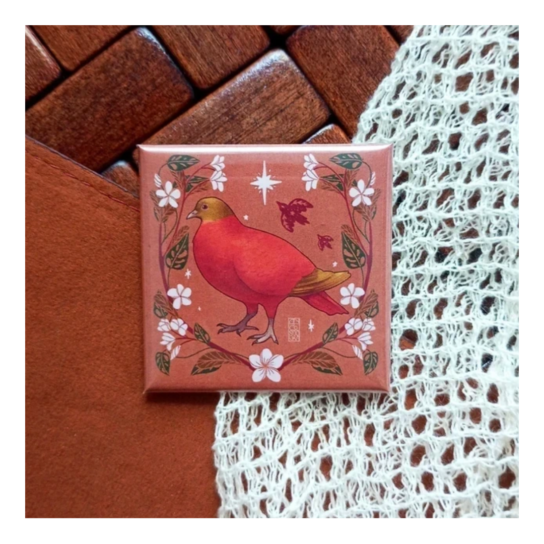 Ręcznie rysowana przypinka z owocożerem ognistym (Orange Fruit Dove) na jasnobrązowym tle.