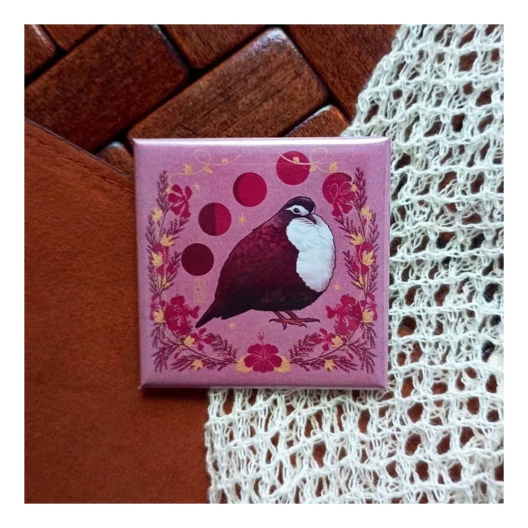 Ręcznie rysowana przypinka z wyspiarkiem białobrewym (White-breasted Ground Dove) na tle w odcieniu brudnego różu.