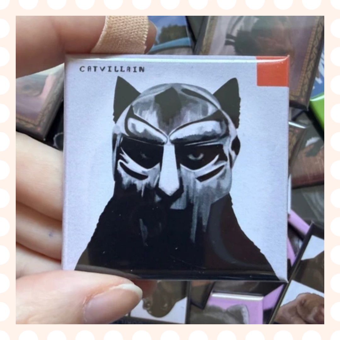 Ręcznie rysowana przypinka o wymiarach 50×50 mm inspirowana klimatem albumu Madvillainy projektu Madvillain. W mojej autorskiej reinterpretacji zamiast artysty w kultowej masce pojawia się kot, a podpis został zmieniony na „Catvillain”. Rysunek jest częścią całej serii moich zwierzęcych wersji kultowych albumów muzycznych. Przypinka świecie nada się jako ozdoba na torbę, plecak, kurtkę lub dodatek dla fanek kotów czy Madvillain. Posiada klasyczne zapięcie na agrafkę, jest lekka i trwała.