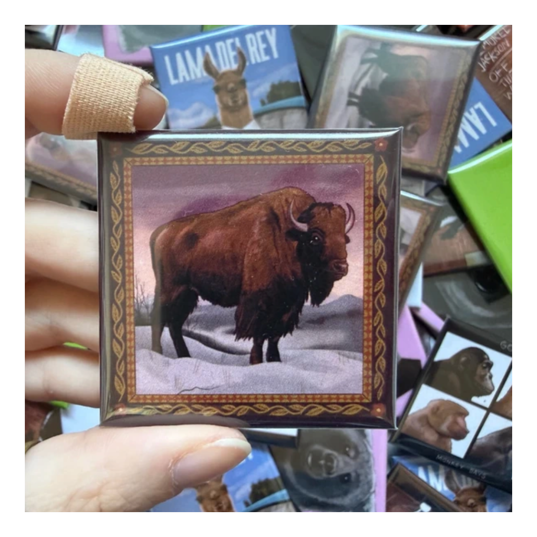 Ręcznie rysowana przypinka przedstawiająca majestatycznego żubra na zimowym tle, otoczonego delikatną folkową ramką inspirowaną tradycyjną polską sztuką ludową.