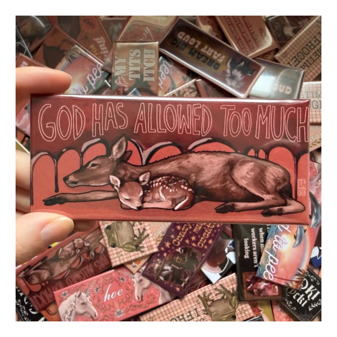 Duża przypinka z napisem „God has allowed too much” przedstawiająca małego jelonka leżącego wtulonego w ciało swojej matki na tle spływającej krwi. Idealna dla fanek dodatków z charakterem. Świetnie wygląda przypięta do torby, plecaka, kurtki jeansowej, płaszcza, shopperki lub jako element kolekcji pinów. Posiada klasyczne zapięcie na agrafkę, jest lekka i trwała.