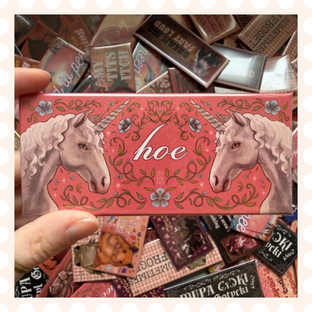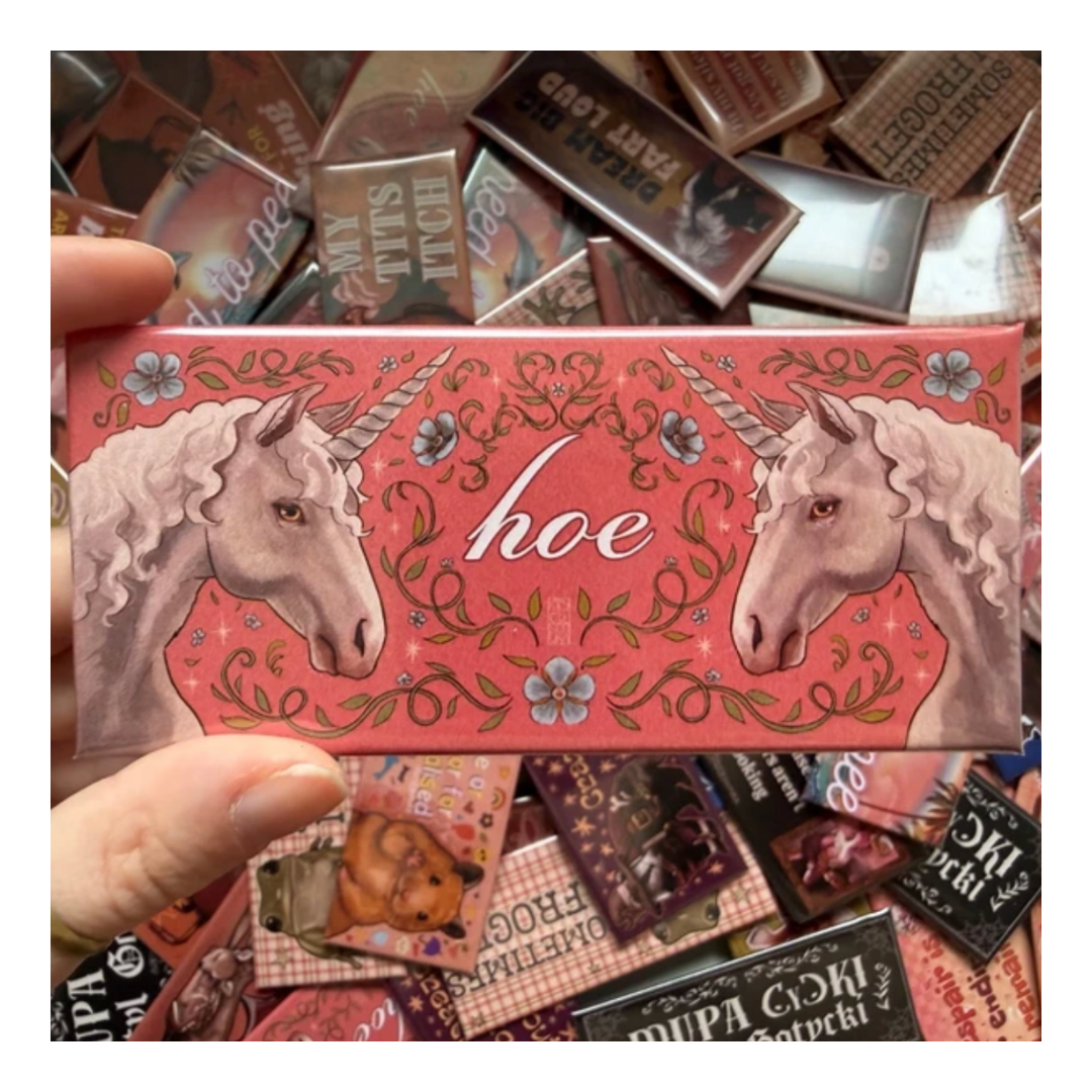Duża różowa przypinka z napisem „hoe” w otoczeniu jednorożców i kwiatów. Postawiłam na delikatną estetykę pełną stereotypowo dziewczyńskiego klimatu skontrastowaną z prowokacyjnym napisem. Pin świecie nada się jako ozdoba na torbę, plecak, kurtkę lub dodatek dla fanek jednorożców czy autoironicznego humoru. Posiada klasyczne zapięcie na agrafkę, jest lekka i trwała.