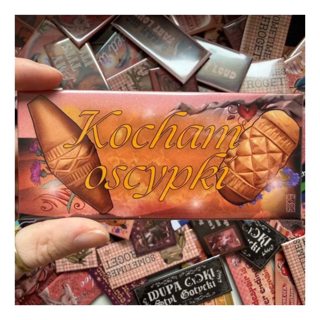 Duża przypinka 54x120mm z napisem „Kocham oscypki” oraz ilustracją oscypków w uroczym, lekko humorystycznym stylu inspirowanym klimatem grafik typu „Smacznej kawusi”. Powstała z miłości do podhalańskich serków i specyficznej estetyki internetu naszych rodziców/dziadków. Idealnie nada się dla podzielających moją miłość czy jako prezent. Świetnie wygląda przypięta do torby, plecaka, kurtki jeansowej, płaszcza, shopperki lub jako element kolekcji pinów. Posiada klasyczne zapięcie na agrafkę, jest lekka i trwała.