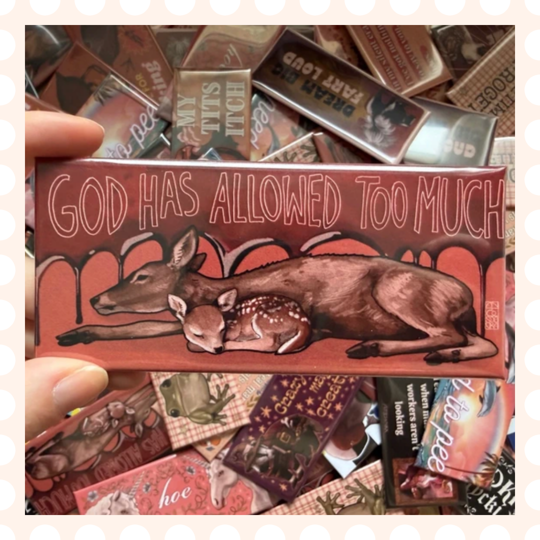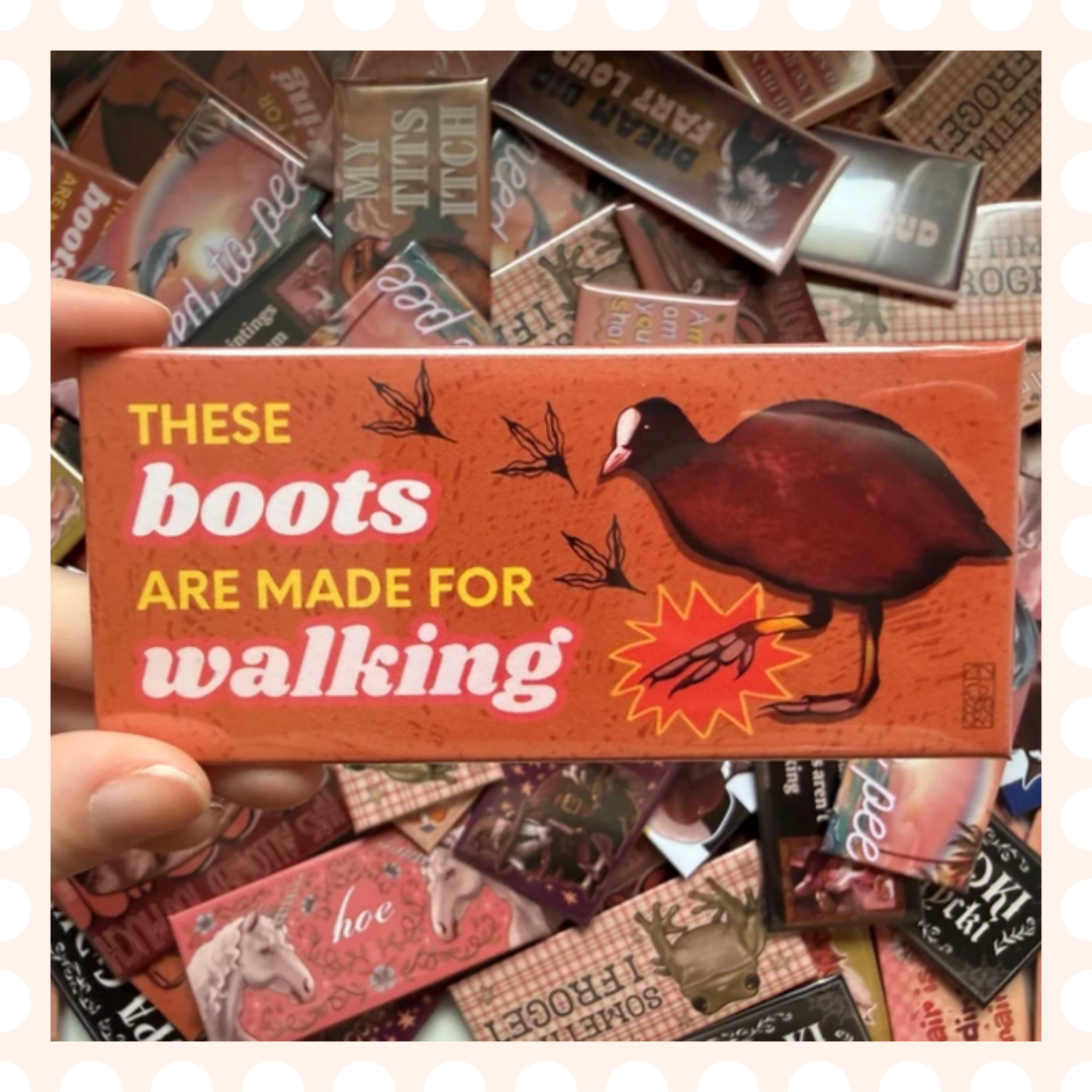 Duża przypinka z napisem „These Boots are made for walking” z piosenki Sinatry w towarzystwie łyski, znanej ze swoich charakterystycznych, dużych stóp.