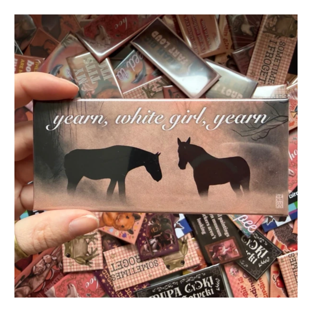 Duża przypinka 54x120mm z napisem „learn, white girl, yearn” oraz ilustracją koni w stylu popularnych memów internetowych – balansuje między romantyzowaniem życia a żartem z przesadnej nostalgii i tzw. „yearning core”. Sama przypinka świetnie wygląda przypięta do torby, plecaka, kurtki jeansowej, płaszcza, shopperki lub jako element kolekcji pinów. Nada się również idealnie na prezent dla koniary czy koleżanki obeznanej w kulturze internetowej. Posiada klasyczne zapięcie na agrafkę, jest lekka i trwała.